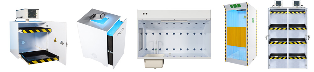 - Ex : cabine de décontamination, douches de sécurité, armoires de stockage produits toxiques, poubelles chimiques, carters protection machine….